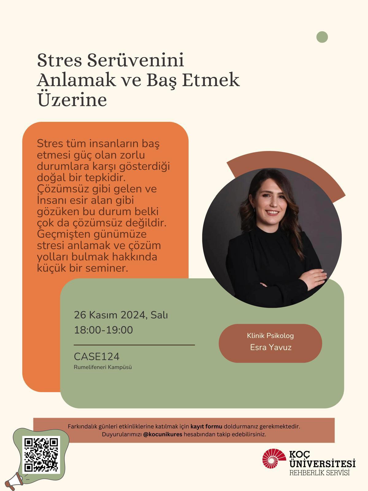 Koç Üniversitesi öğrencilerine yönelik, Farkındalık Haftası kapsamında stres konulu bir seminer gerçekleştirdim.